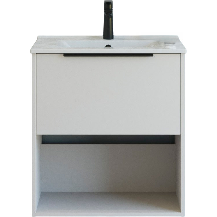 Smart møbelpakke med 60 cm bredt vaskeskab fra Dansani Mido+ Classic. Skuffe og åbent rum giver både skjult og let tilgængelig opbevaring. Med Amber vask i porcelæn.