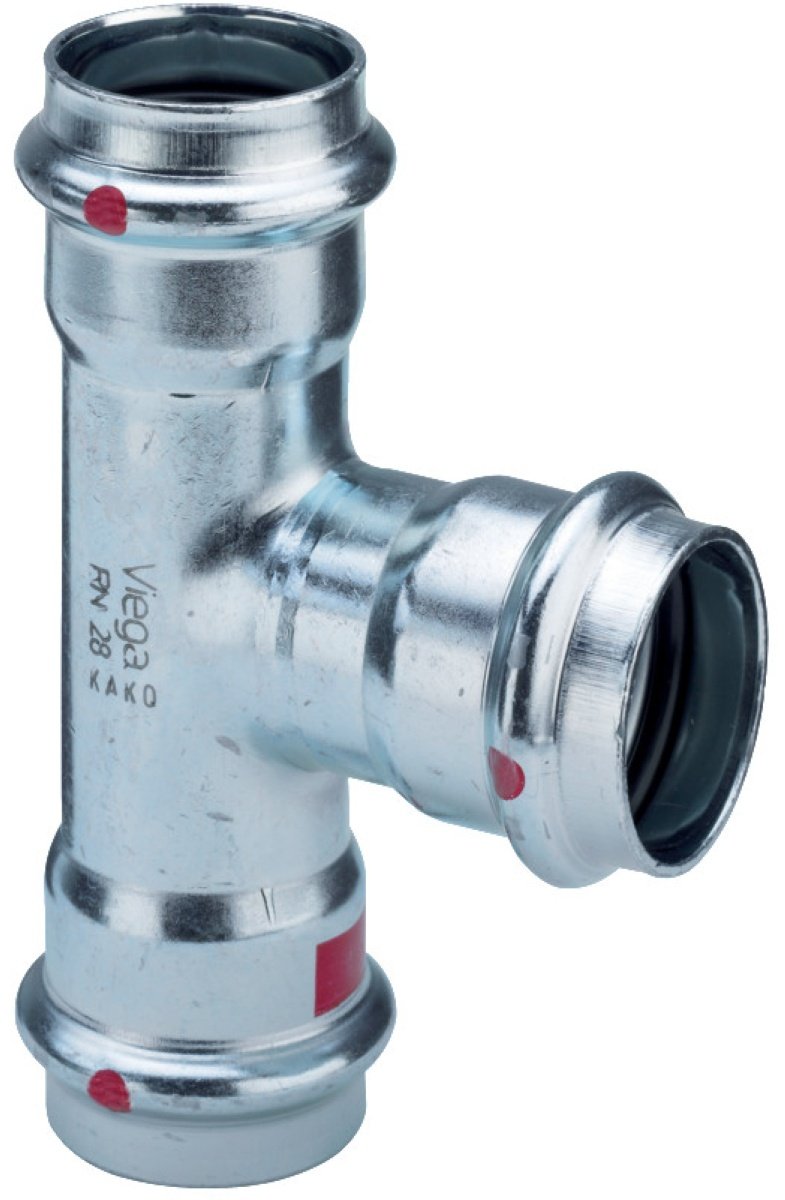 Prestabo T-stykke udført i galvanisk forzinket ulegeret stål. Anvendes til varme, køleanlæg og trykluft. Må IKKE bruges til drikkevand. Dimensioner: 15-108 mm.