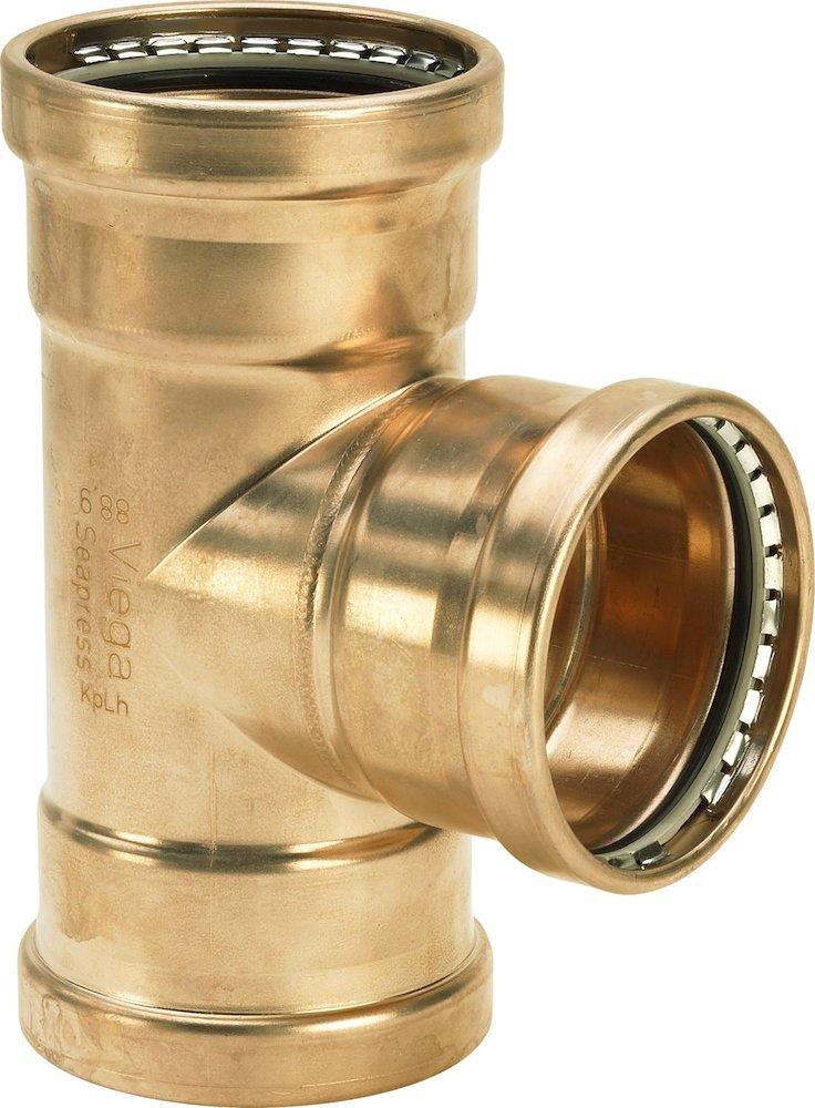 Pres T-stykke af CuNi10Fe1,6Mn legering. Til marine miljøer. Hurtig koldsamling uden lodning eller svejsning. Ideel til skibsbygning, brandslukning og havvandskøling.