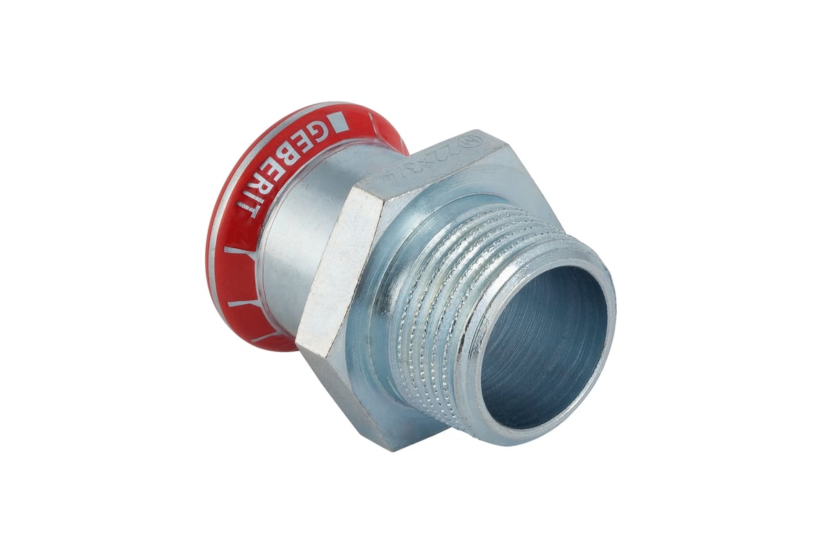 Geberit Mapress FZ overgang, el-forzinket. Ideel til varme- og køleanlæg. Med presseindikator, utæt ved manglende presning, og ombytteligt frem- og tilbageløb.