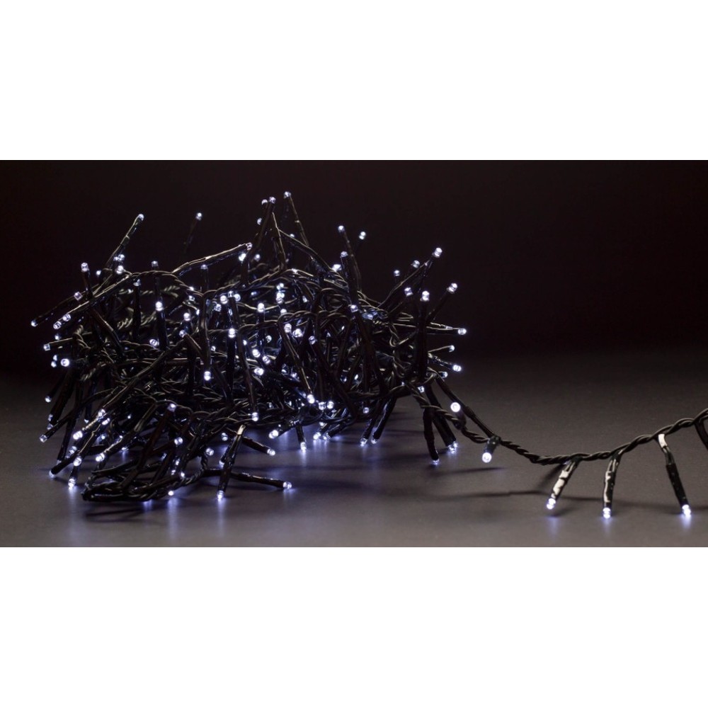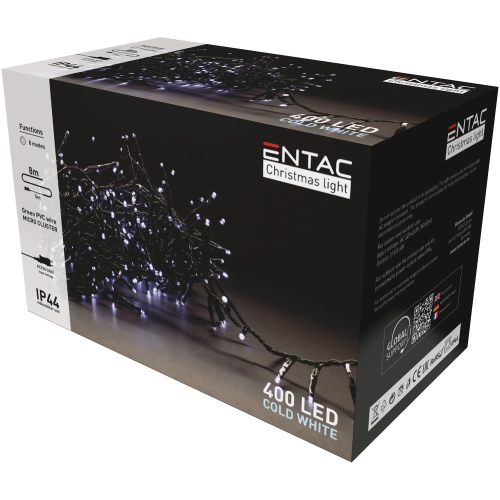 8 meter LED julelyskæde med 400 kold hvide lys, memory funktion og IP44-klassificering til udendørs brug. Tilsluttes 230V.