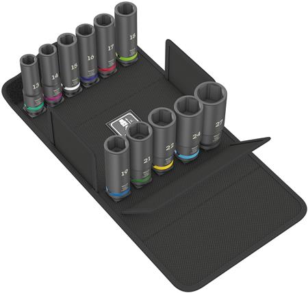 Sæt med 11 Impaktor Deep topnøgler til elektriske eller trykluftdrevne slagskruetrækkere med 12,5 mm (1/2") tilslutning. Lang udførelse til dybtliggende skrueforbindelser.
