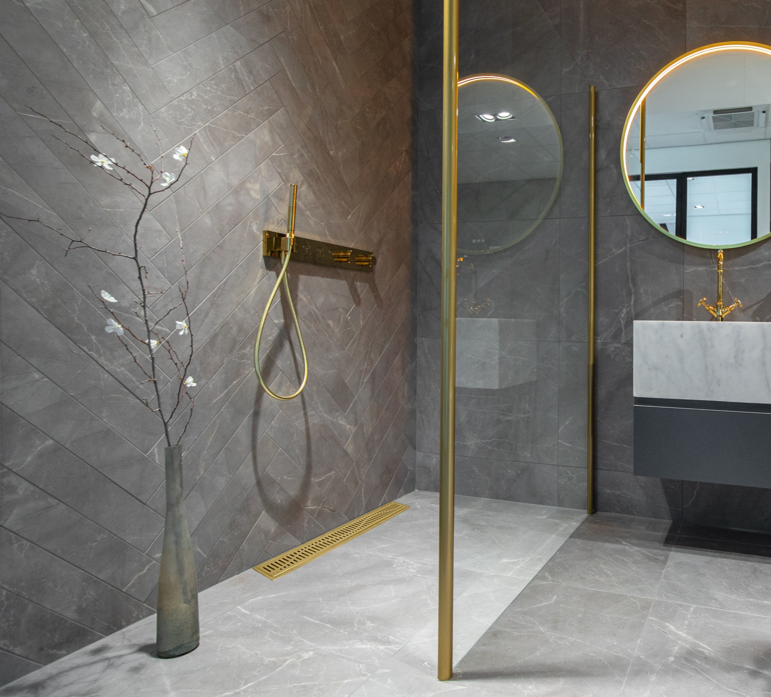 Den matte guld finish tilføjer et eksklusivt touch til badeværelset, mens Wave ristens design sikrer en effektiv vandafledning.