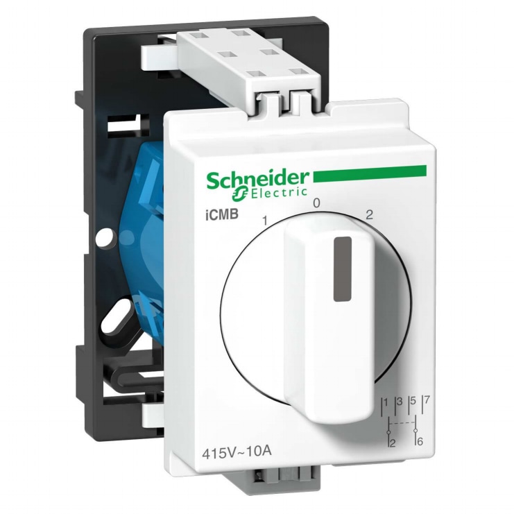 Acti9 drejeomskifter iCMB er designet til styring og kontrol af elektriske kredsløb. Denne 2-polede omskifter med nulstilling giver mulighed for manuel kontrol af et kredsløb med 2-polede operationer og en stop position.