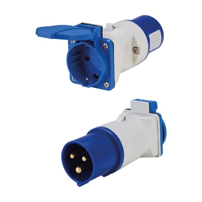 Robust adapter fra IEC 309 CEE han 16A, 3P til Schuko hun, med IP44-klassificering for sikker brug i fugtige miljøer.