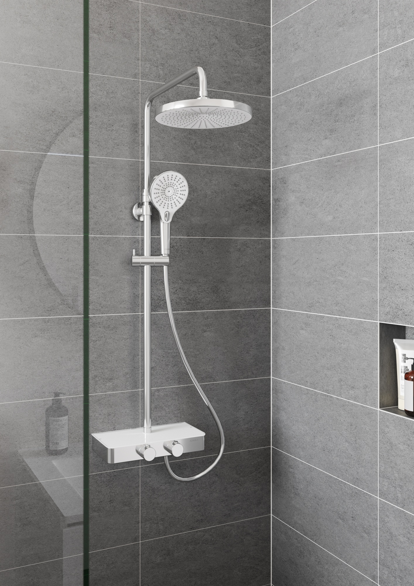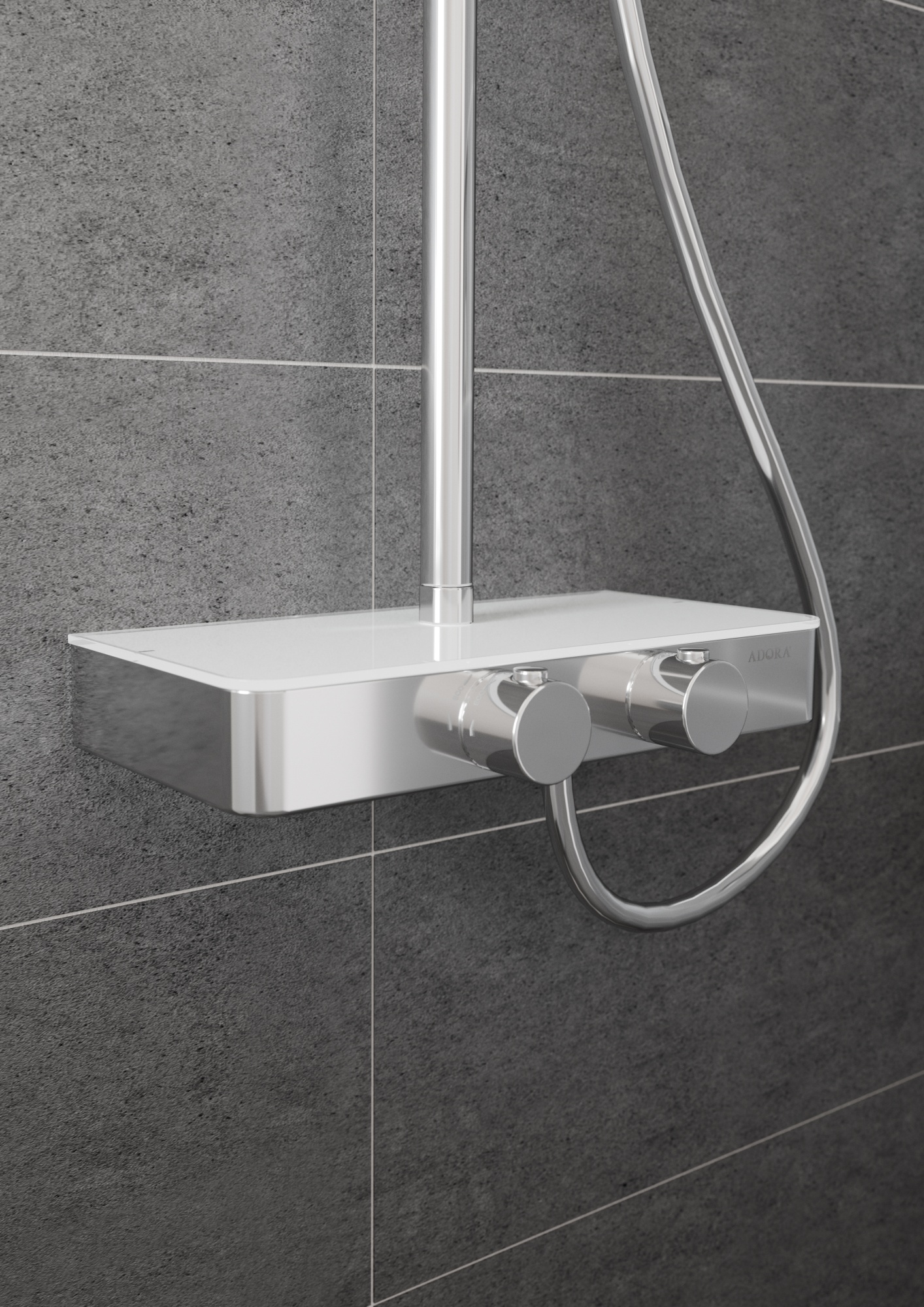 ADORA® Consilio L 250 termostatbrusesæt med afsætningsplads back to wall, krom/hvid.