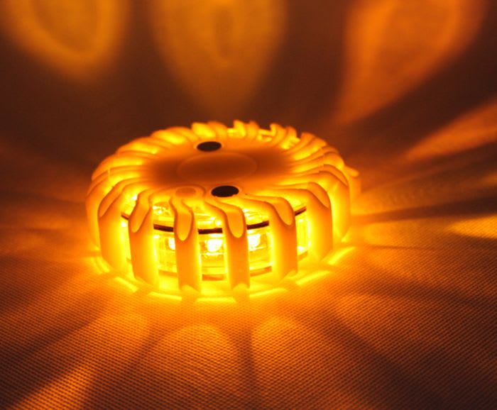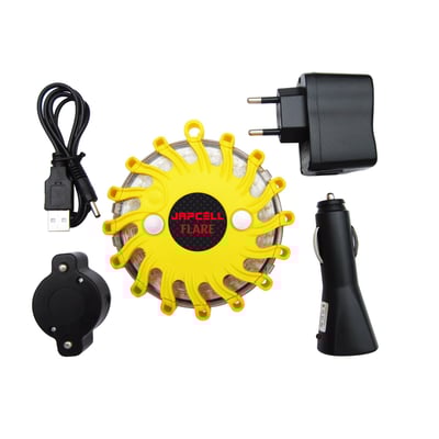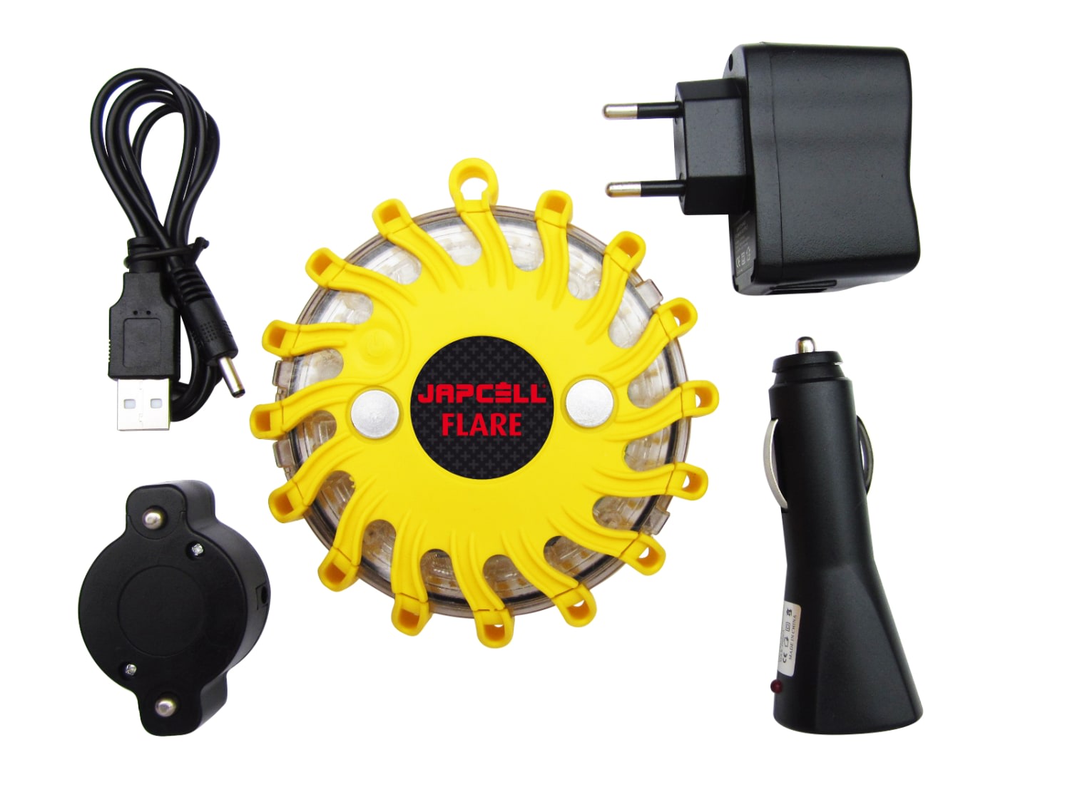 Genopladelig advarselslampe med 16 LED-lys og 9 driftstilstande. Inkluderer magnetisk opladningsstation, USB til 3,5 mm stik, 12V biloplader og USB-vægoplader.