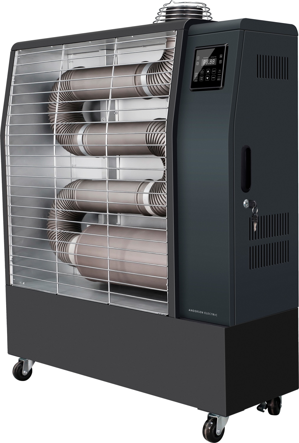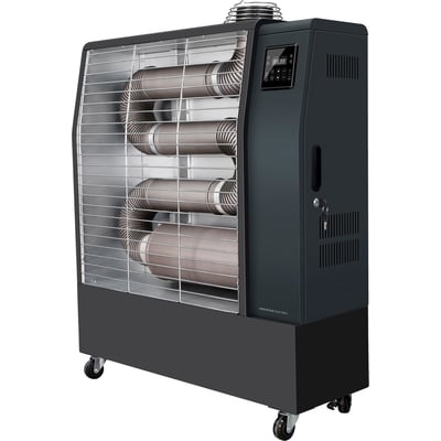 Effektiv infrarød dieselvarmer på 16KW med WiFi og mobilstyring. Ideel til indendørs brug og opvarmning af op til 120 m². Antracitfarvet gulvmodel.