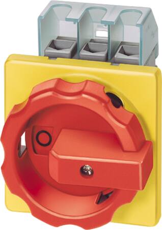 4-polet nødafbryder fra Siemens med IU=25, P/AC-23A ved 400V=9,5 kW, frontmontage, centerhulsmontage og rød/gul aktiveringselement.