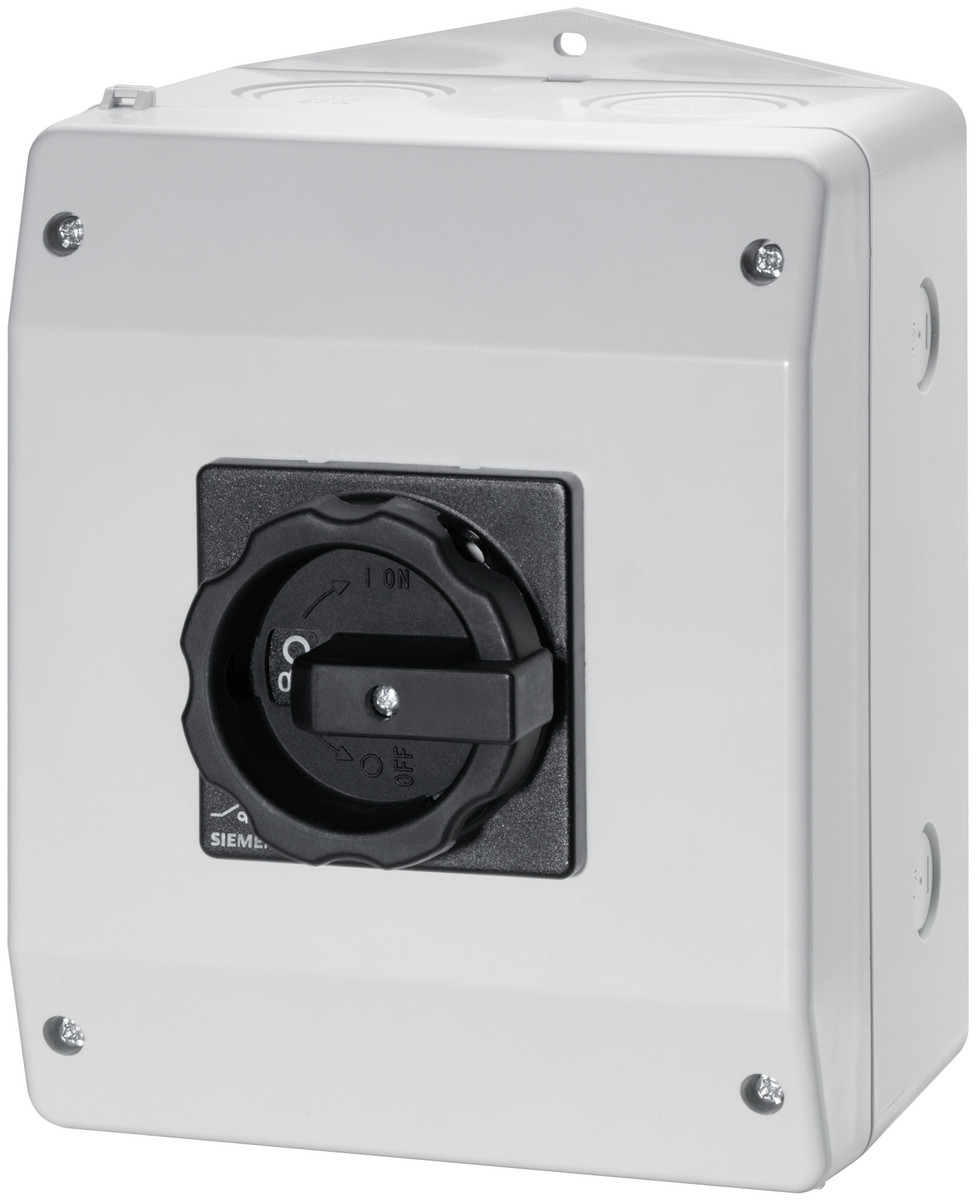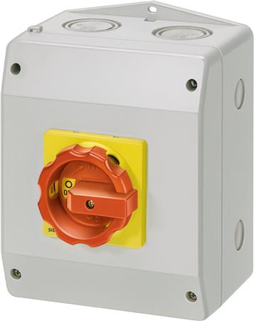 6-polet hovedafbryder IU=32, P/AC-23A ved 400V=11,5 kW med 2 N-klemmer, kunststofkapsling og IP65. Drejeknap i sort.
