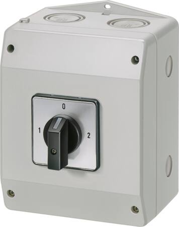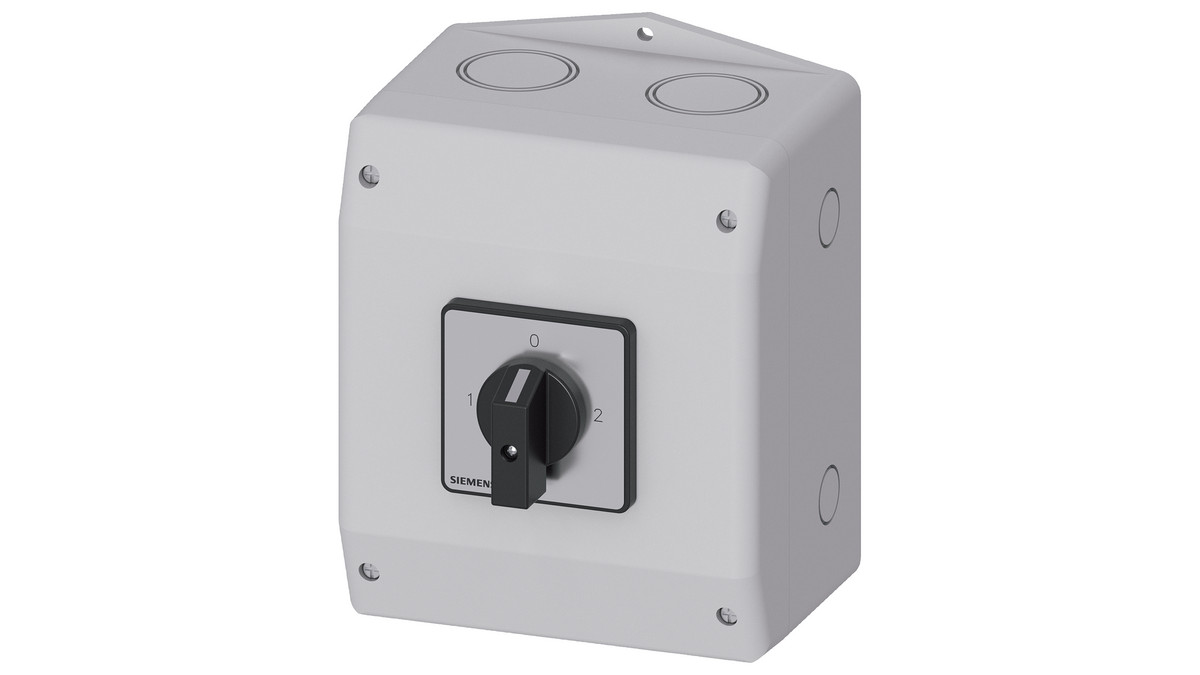3-polet omskifter fra Siemens. IU=32, P/AC-23A ved 400V=11,5 kW. Med 2 N-klemmer, kunststofkapsling og IP65. Drejegreb SW, kan ikke aflåses.