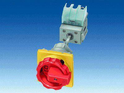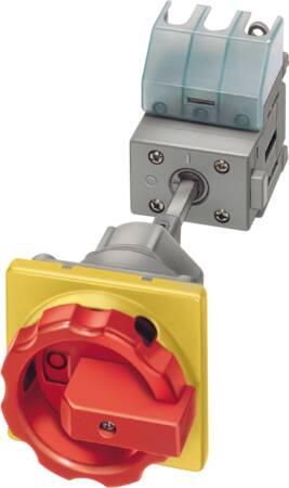 4-polet nødafbryder fra Siemens med IU=63. P/AC-23A ved 400V=22 kW. Til bundmontage, DIN-skinner/tohulsmontage med rød/gul aktiveringselement.