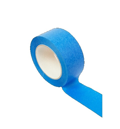 Roliba afdækningstape i blå, 130 my, 50 mm x 50 meter. UV-resistent med akrylbaseret klæbemasse, ideel til udvendig bygningsmaling og langtidsafdækning.