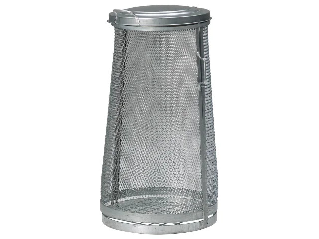 Sækkeholder i galvaniseret plade med strækmetal, der beskytter mod fugle og dyr. Med klemring til affaldspose. Øvre/nedre diameter 465/540 mm.