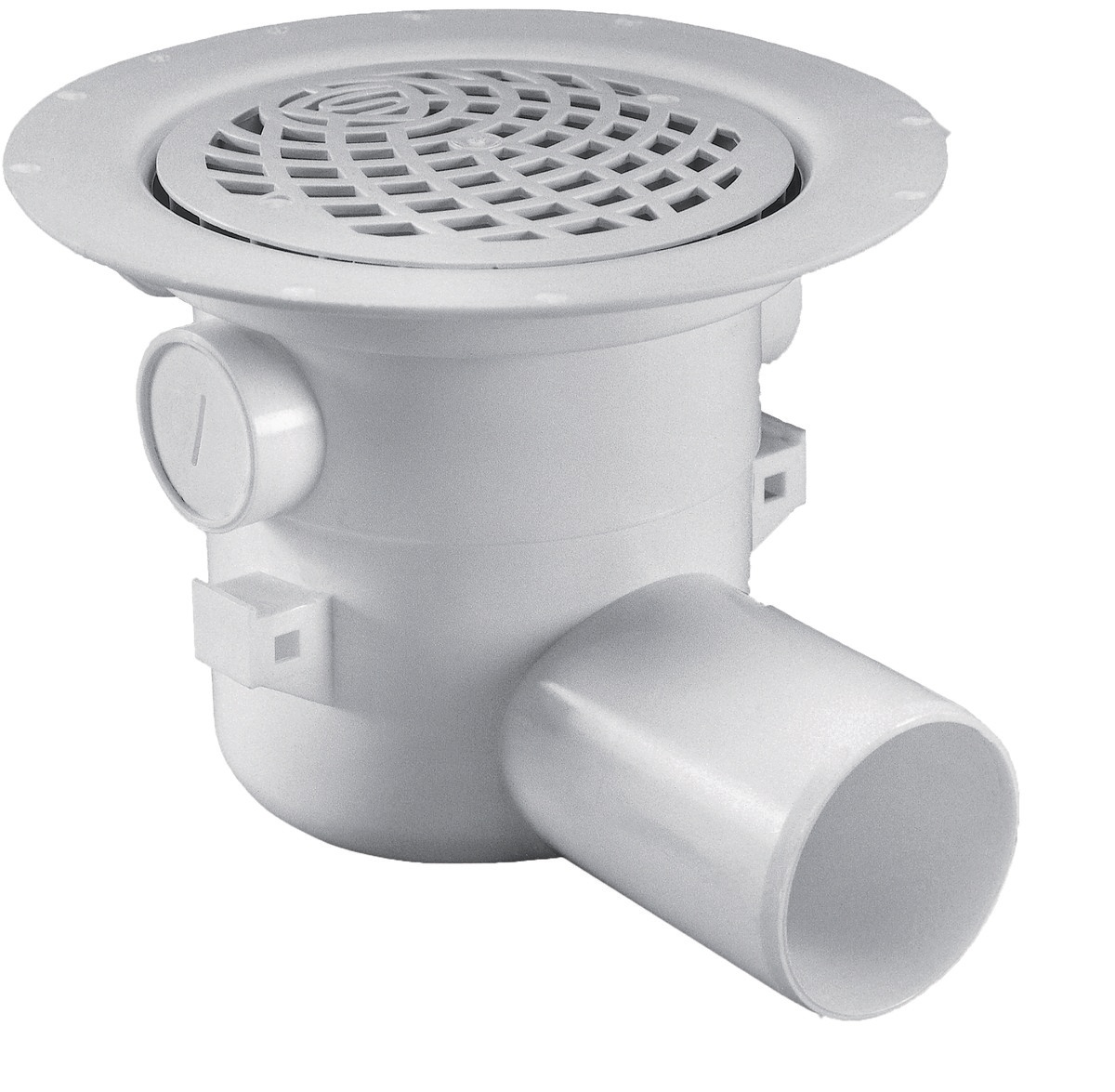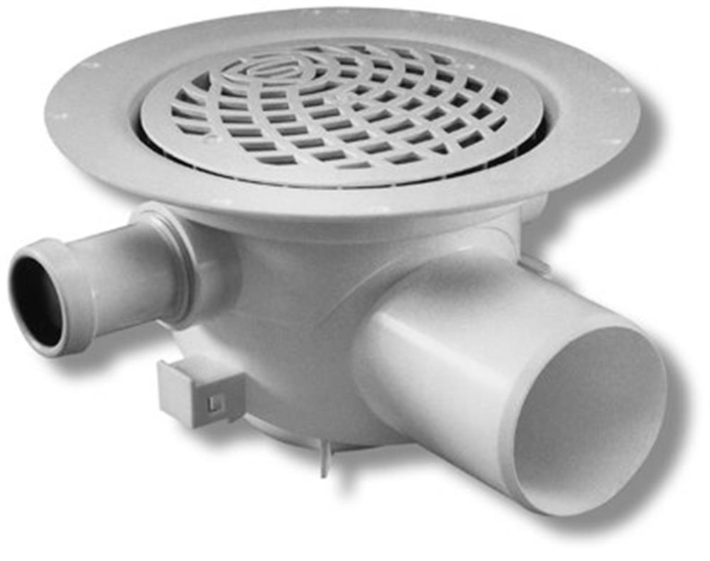 Purus VÅKE afløbsskål med vandret udløb til vinylbelægning. Med indbygget vandlås og 3 sideindløb. Leveres med hvid plastrist.