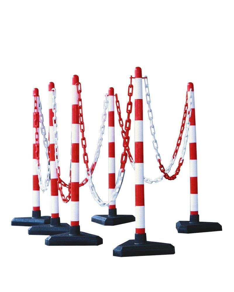 Sæt med 6 rød/hvide afspærringsstolper og 10 meter kæde, ideelt til midlertidige afspærringer både indendørs og udendørs. Stolperne er 870 mm høje med en diameter på 40 mm.