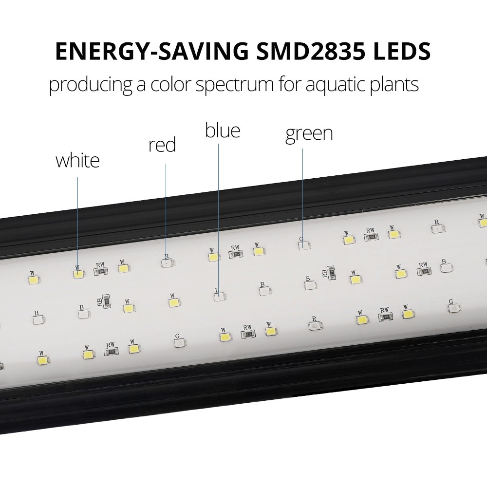 Akvarie armatur med 11W LED i hvid, blå, rød og grøn. Justerbar længde for nem tilpasning. Dæmpbar og IP66-klassificeret for optimal funktion og holdbarhed.