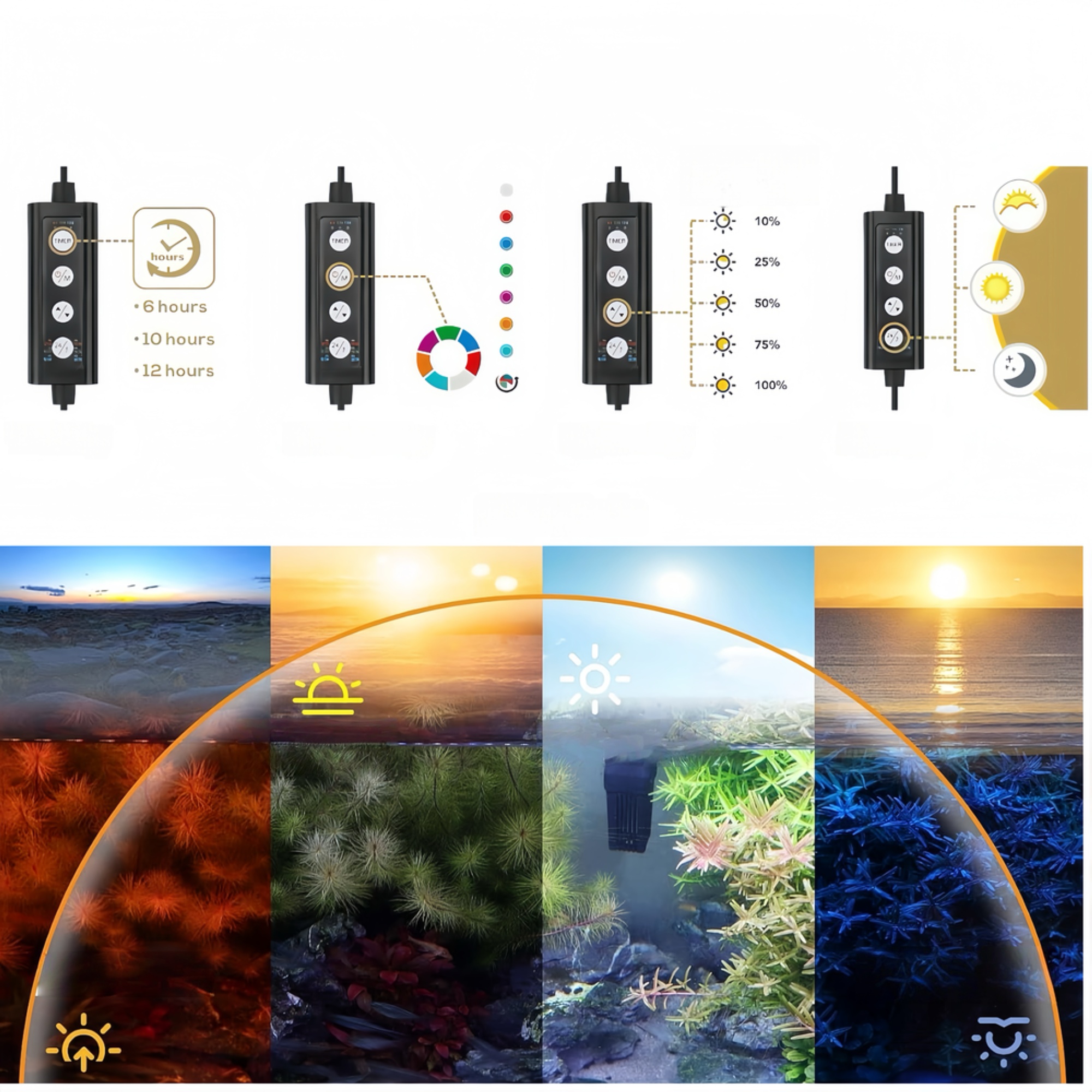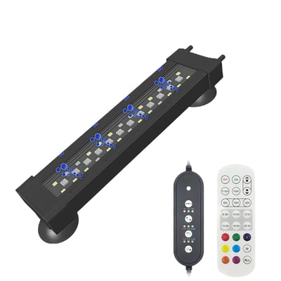 Oplev et farverigt og naturligt lys i dit akvarium med dette 20 cm RGB+NW akvarie armatur. Med IP68-klassifikation og luftpumpetilslutning er det ideelt til at skabe den rette stemning under vand.