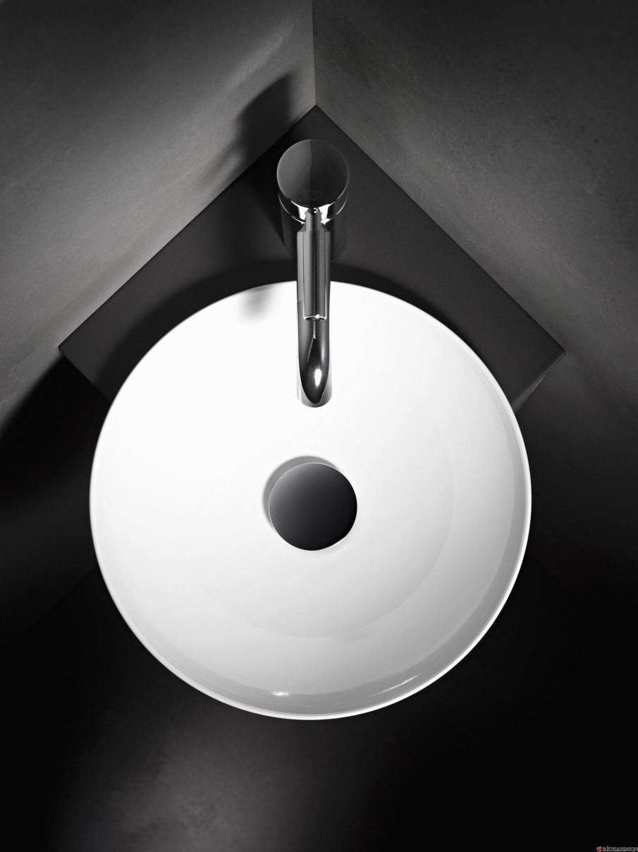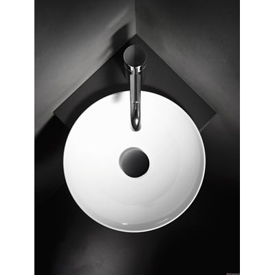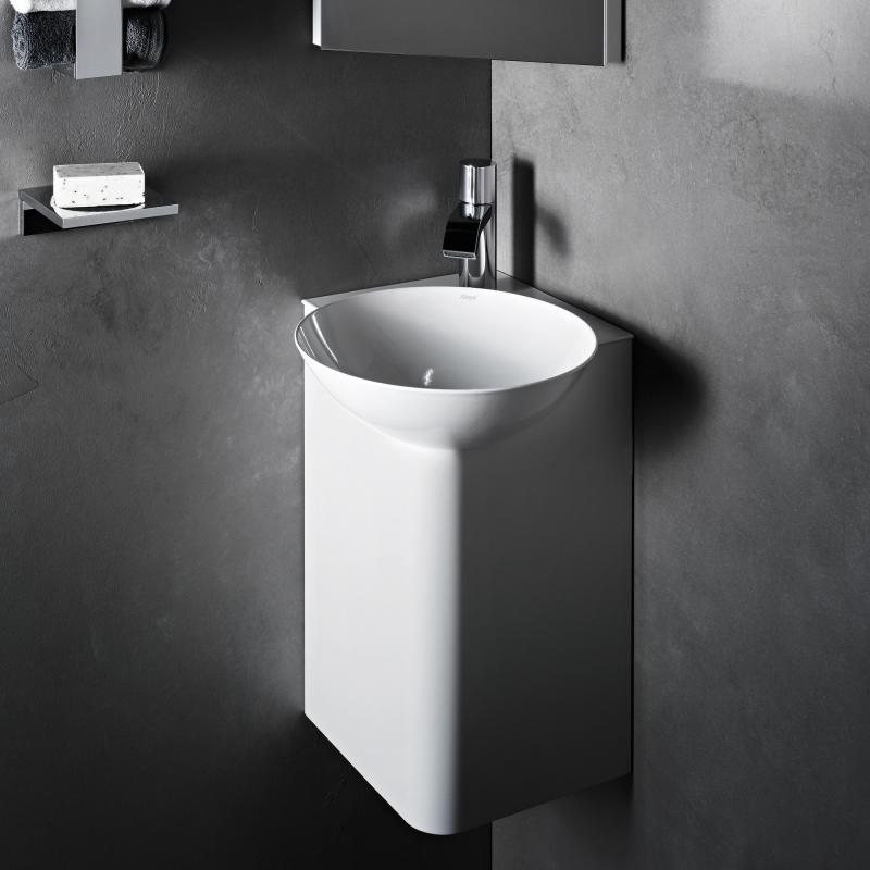 Hjørnevaskeenhed fra Alape med antibakteriel overflade og hanehul. Mål: 355x432x471 mm.