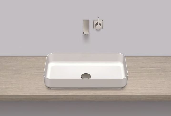 Alape SB.SR650 skålformet håndvask i hvid glaseret stål med ProShield antibakteriel overflade. Firkantet design til bordmontering.