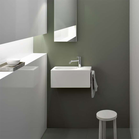 Vægmonteret Alape vaskeenhed i glaseret stål med antibakteriel ProShield overflade, hanehul og firkantet udformning. Ideel til badeværelset.