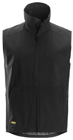 Praktisk softshellvest i sort, str. M. Vindtæt og vandafvisende med forlænget ryg og høj krave.