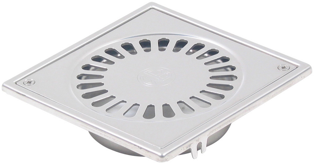 Altanafløb SQUARE 150x150 med skruelås. Velegnet til beton- og flisegulve. Ramme: 147x147mm. Udløb: Ø100mm, lodret. Fremstillet i rustfrit stål AISI304/EN1.4301.