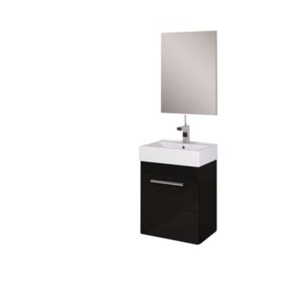 Komplet pakke til det lille badeværelse. Pakken indeholder underskab, håndvask og spejl. Stilrent sort look med højglanspolerede låger, én låge og krom greb.