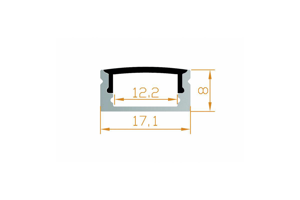 Aluminiumsprofil 8 med klar cover. 2,5 meter lang, 17,1 mm bred og 8 mm høj. Velegnet til montering og køling af LED bånd.
