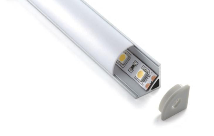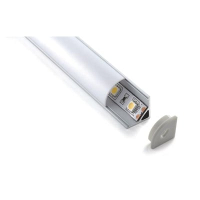Aluminiums hjørneprofil 2-1616B til montering i overgangen fra væg til loft. Opal cover. Mål: L:2500 mm, B:16 mm, H:16 mm.