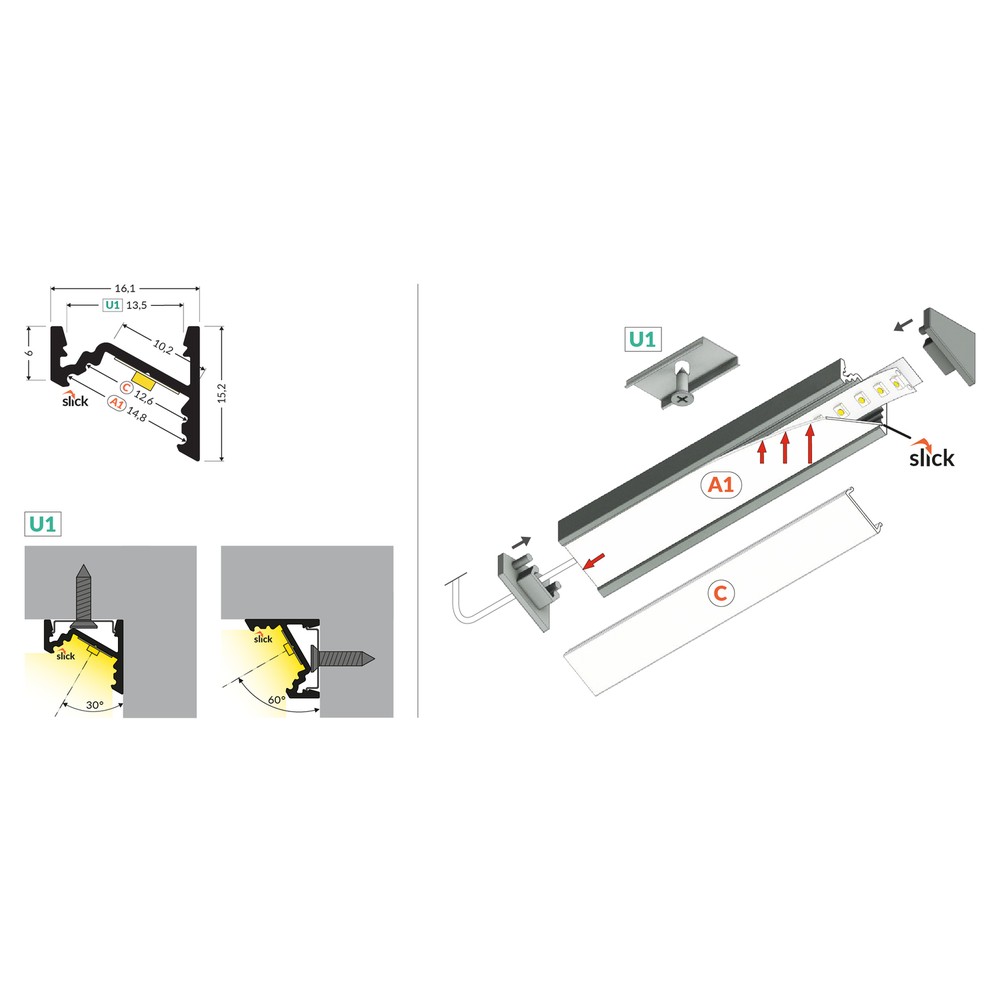 Aluprofil hjørne CORNER10.V2 A1C/U1 - Ubehandlet aluminium, LED skinne