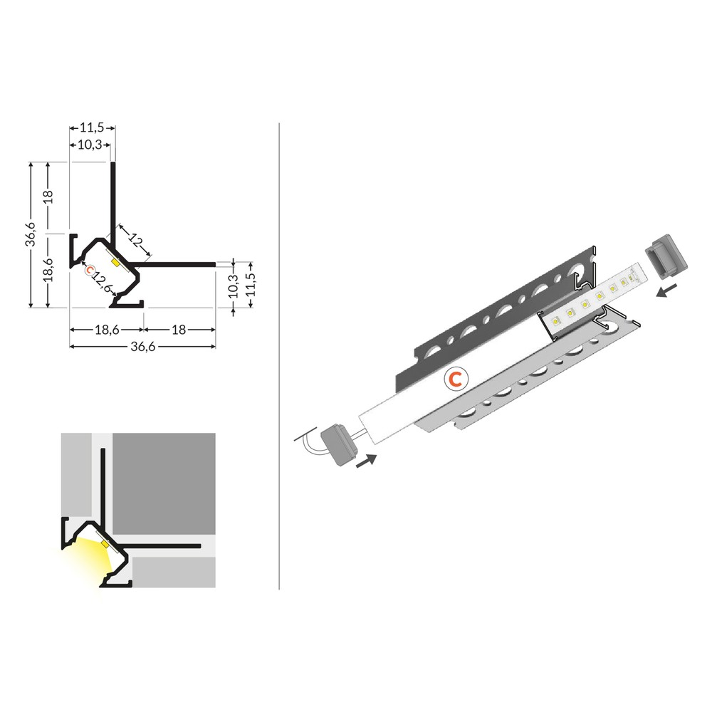 - Anvendelse: Fliseprofil, hjørneprofil, til LED-strips