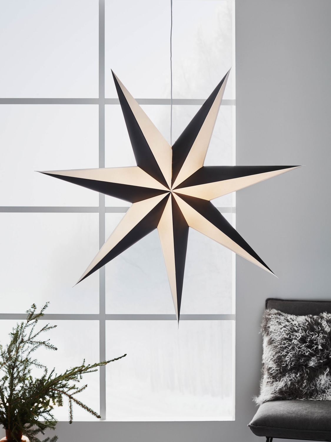 Denne store, hængende stjerne er udført i karton og tilføjer et festligt præg til ethvert rum. Med en diameter på 1 meter er den et iøjnefaldende element i indretningen.