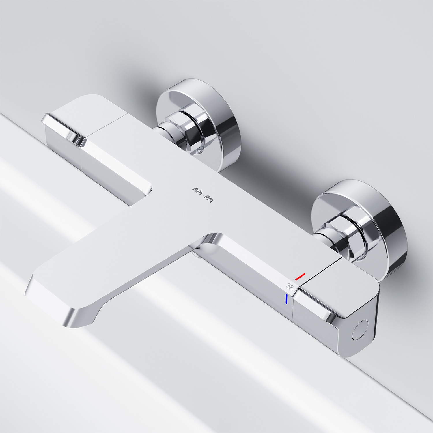 Termostatisk kar- og brusebatteri fra AM.PM i krom. Med 2-grebs betjening, 150 mm centerafstand og skoldningsspær.
