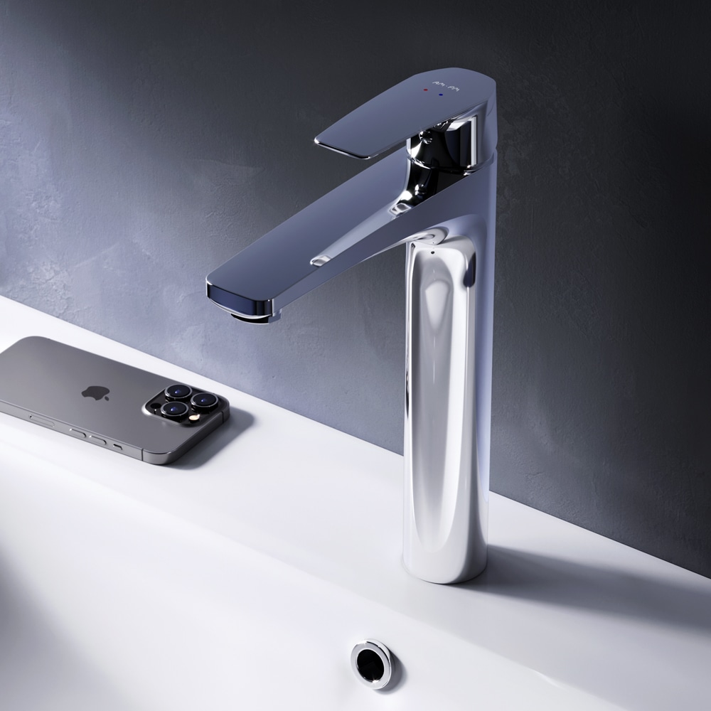 Stilfuldt og funktionelt AM.PM Gem højt håndvaskarmatur i krom og messing. Med 1-grebs betjening og 3/8" tilslutning.