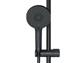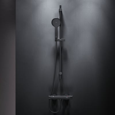 Komplet AM.PM Hit brusesæt i mat sort messing med termostat, skoldningsspærre og vandbesparende funktion. Inkluderer 1750 mm bruseslange og rund håndbruser.