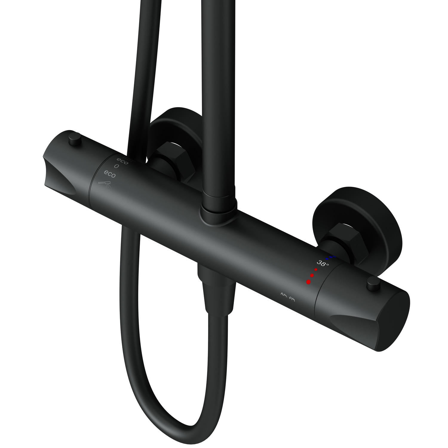 AM.PM Hit brusesættet i mat sort er en stilren og funktionel løsning til badeværelset. Dette komplette brusesystem er fremstillet i robust messing og designet med en elegant mat sort overflade, der komplementerer moderne indretninger. Brusesættet er udstyret med en termostat, som sikrer en konstant og behagelig vandtemperatur under hele brusebadet. Den integrerede skoldningsspærre øger sikkerheden, især i husstande med børn.