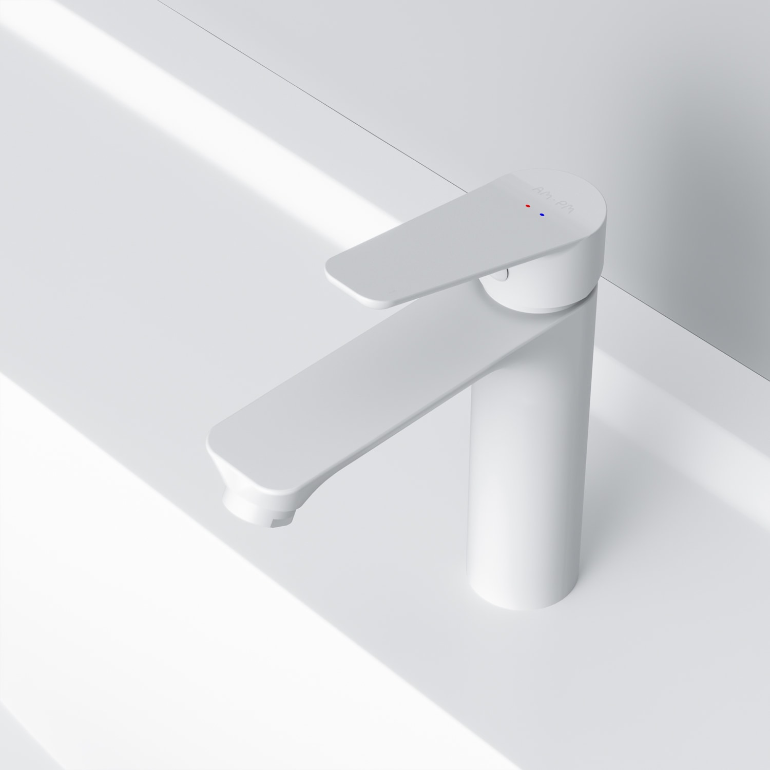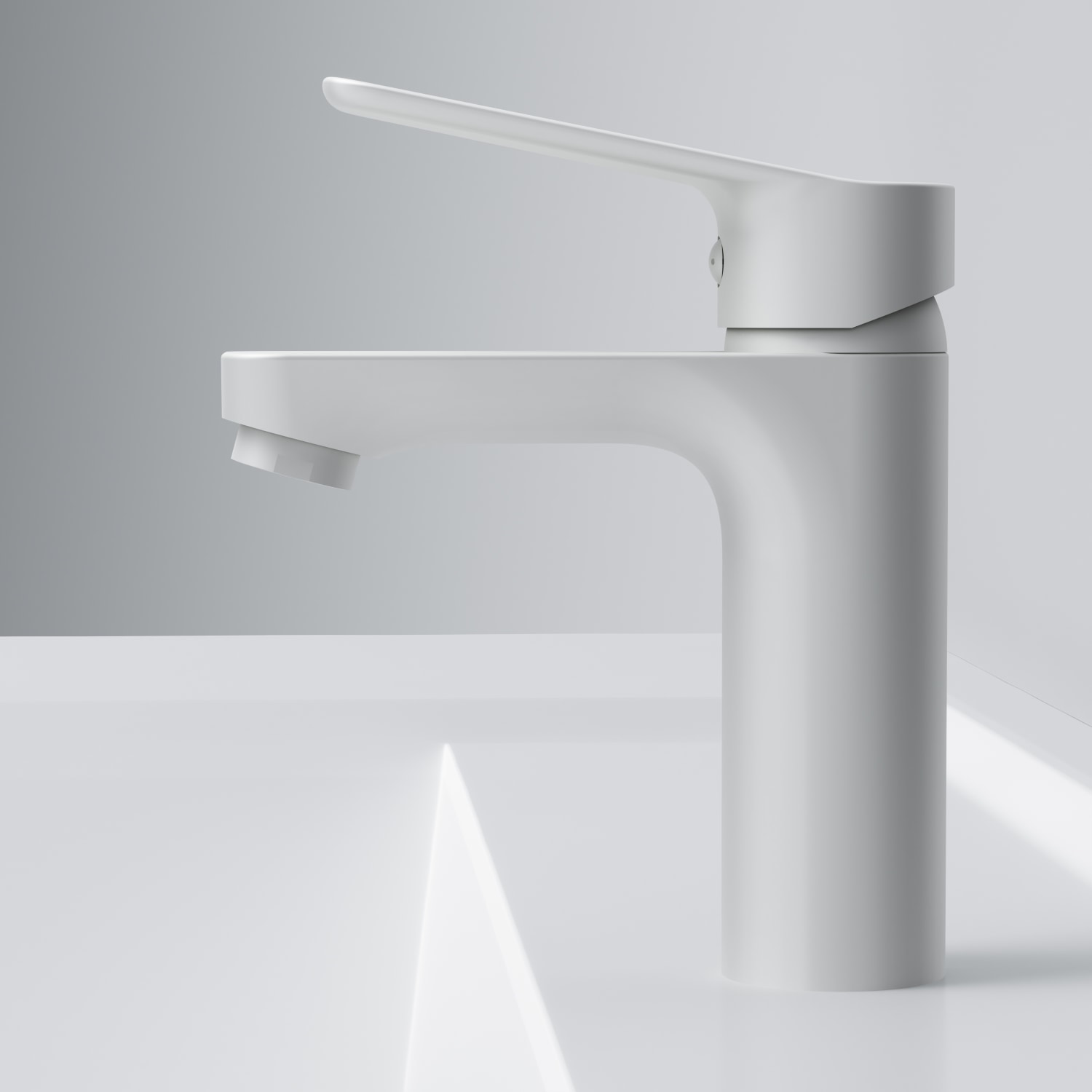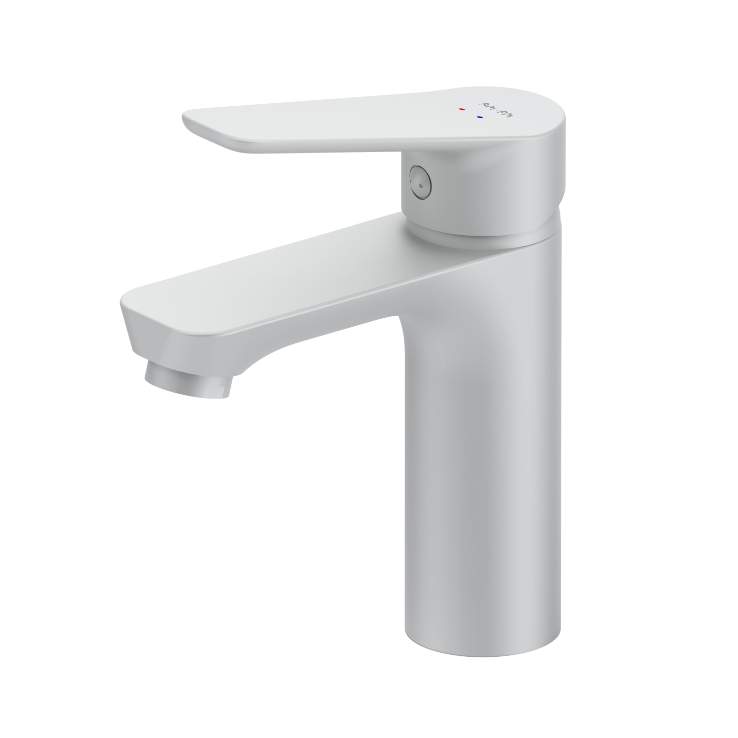 Stilfuldt et-grebs håndvaskarmatur fra AM.PM i hvid mat finish. Fremstillet af messing med 3/8" flexslanger.