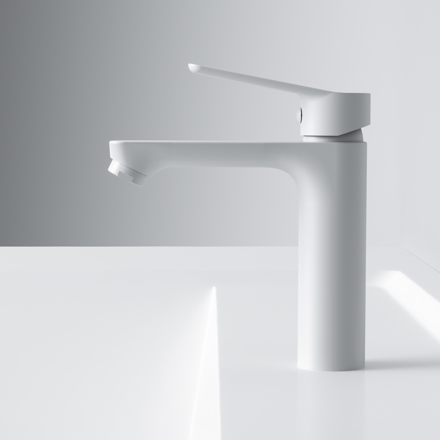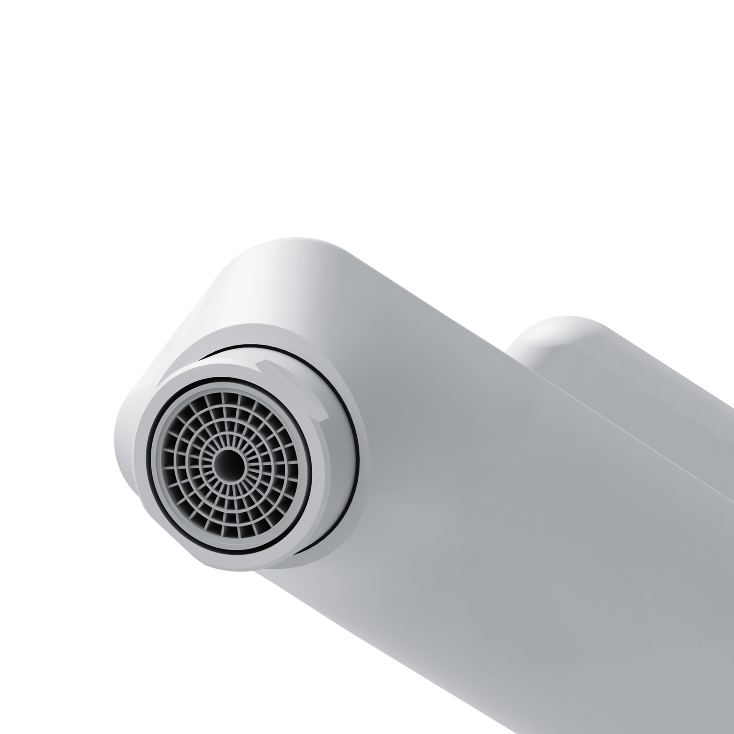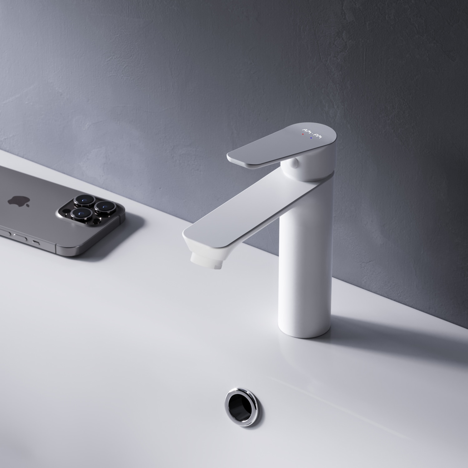 Stilfuldt et-grebs håndvaskarmatur fra AM.PM i hvid mat finish. Fremstillet af messing med 3/8" flexslanger.