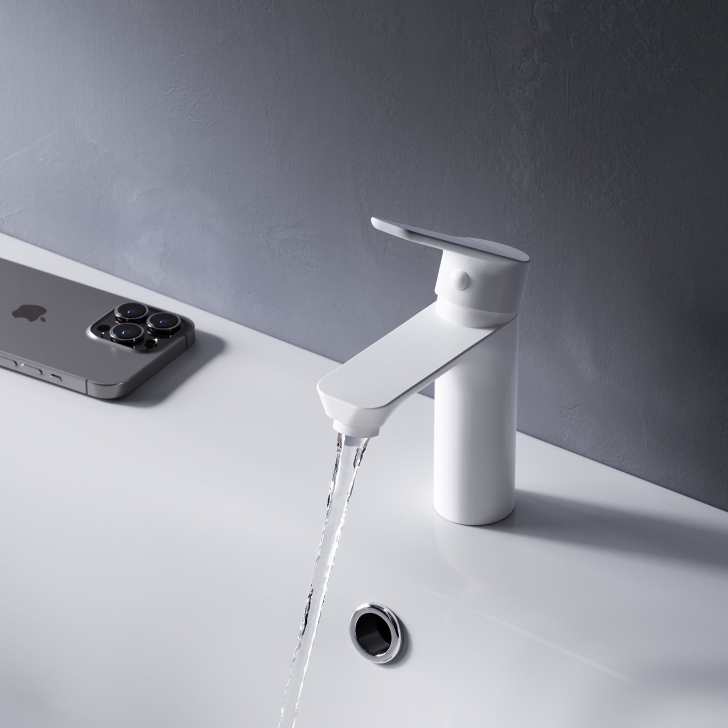 Elegant et-grebs håndvaskarmatur i hvid mat finish. Fremstillet af messing med 3/8" tilslutning.