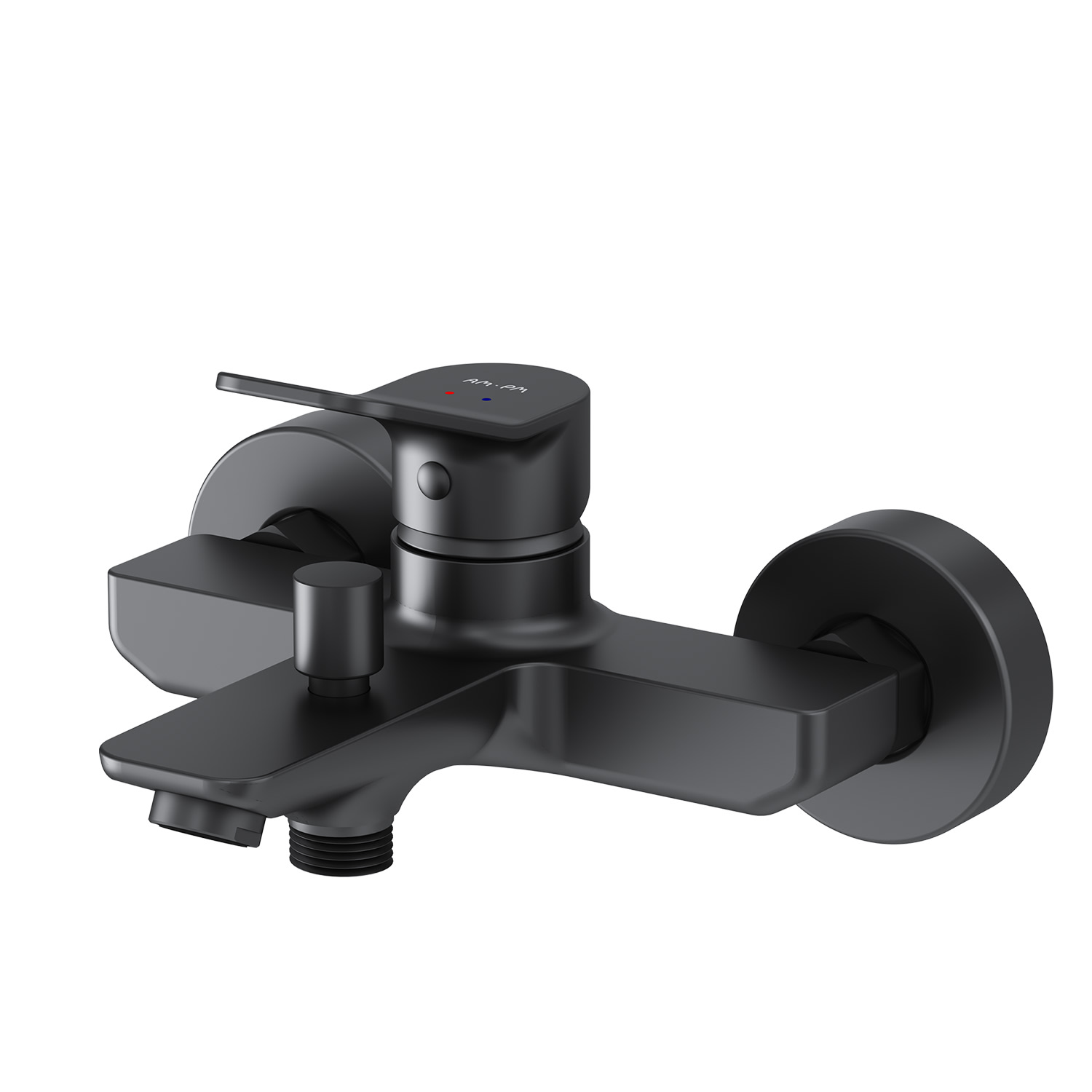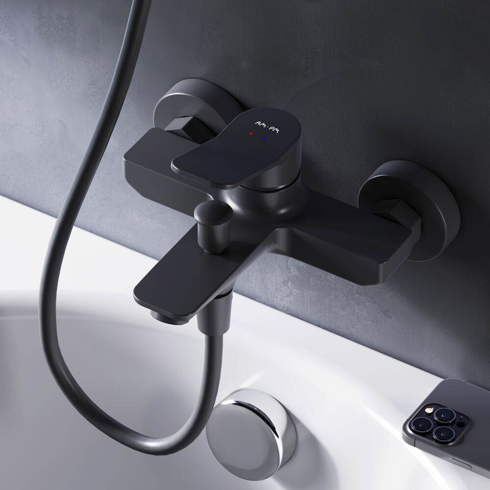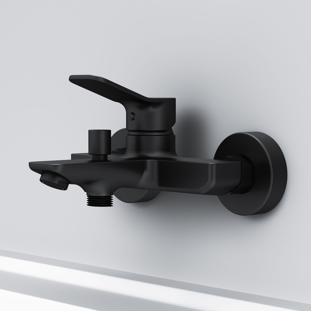 Elegant sort bad- og brusearmatur med 1-grebs betjening og traditionel montering.