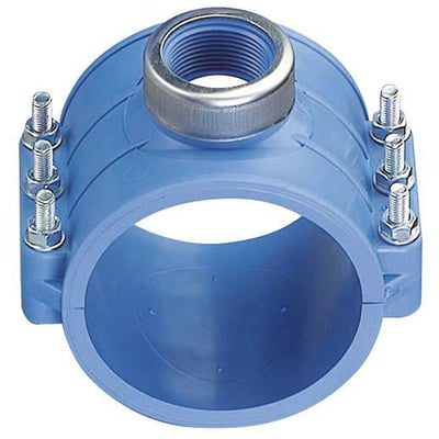Anboringsbøjle i PP til PE- og PVC-rør. Med indvendigt rørgevind og forstærkningsring i rustfrit stål. Trykklasse PN16.