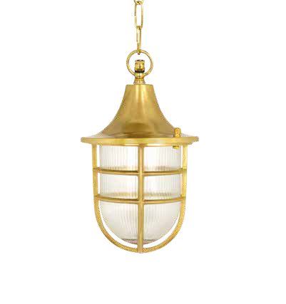 Elegant Andromeda 96K pendel i støbt messing med riflet glas og gitter. IP44-klassificeret, ideel til udendørs brug. Mål: 300 mm høj, 170 mm i diameter.