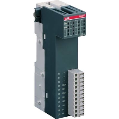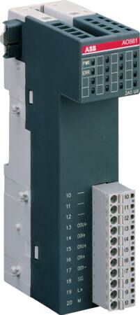 Dette analoge udgangsmodul, AO561:S500, giver mulighed for 2 analoge udgange (AO) med konfigurerbare U/I signaler. Modulet er designet til integration i industrielle automationssystemer.