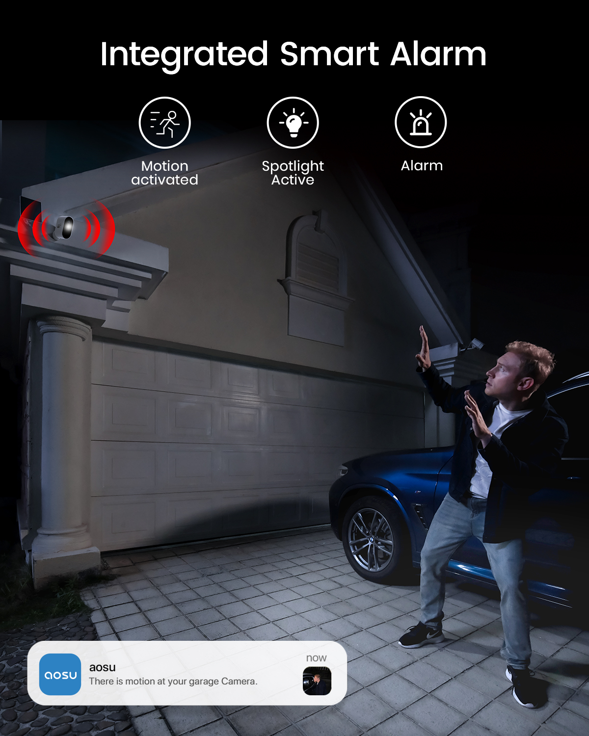 - Spotlight & Siren: Integreret spotlight og sirene kan aktiveres ved bevægelse for at afskrække ubudne gæster.