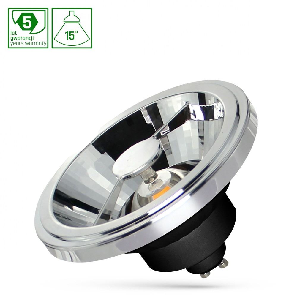Kraftig 12W AR111 LED pære med GU10 fatning. Giver 1000lm lys med 15° spredning og varm 2700K farve. Ikke dæmpbar.