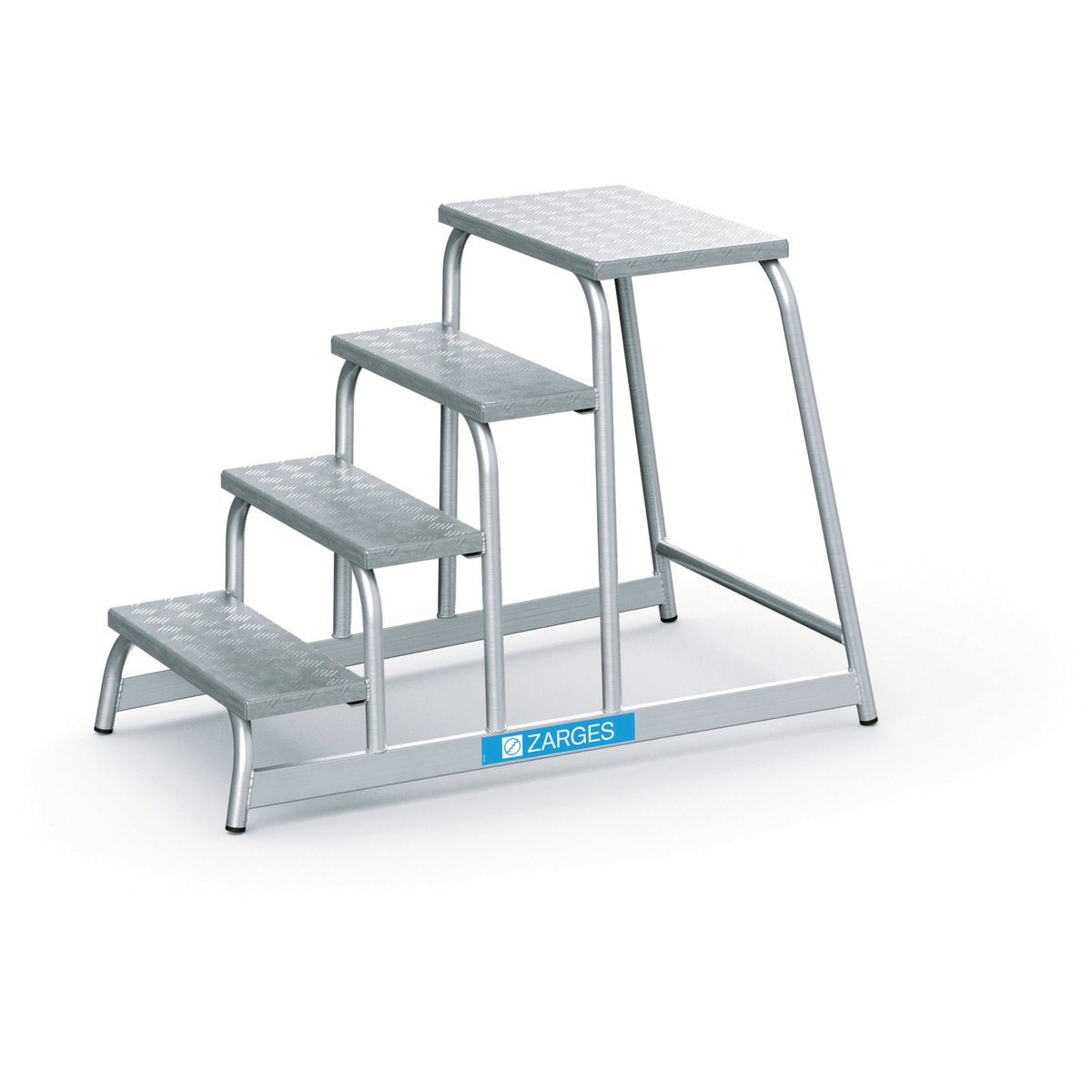 Maskintrin med lav vægt, høj stabilitet og stor ståflade. Sammensvejset rørkonstruktion i aluminium sikrer stabilitet og lang levetid.