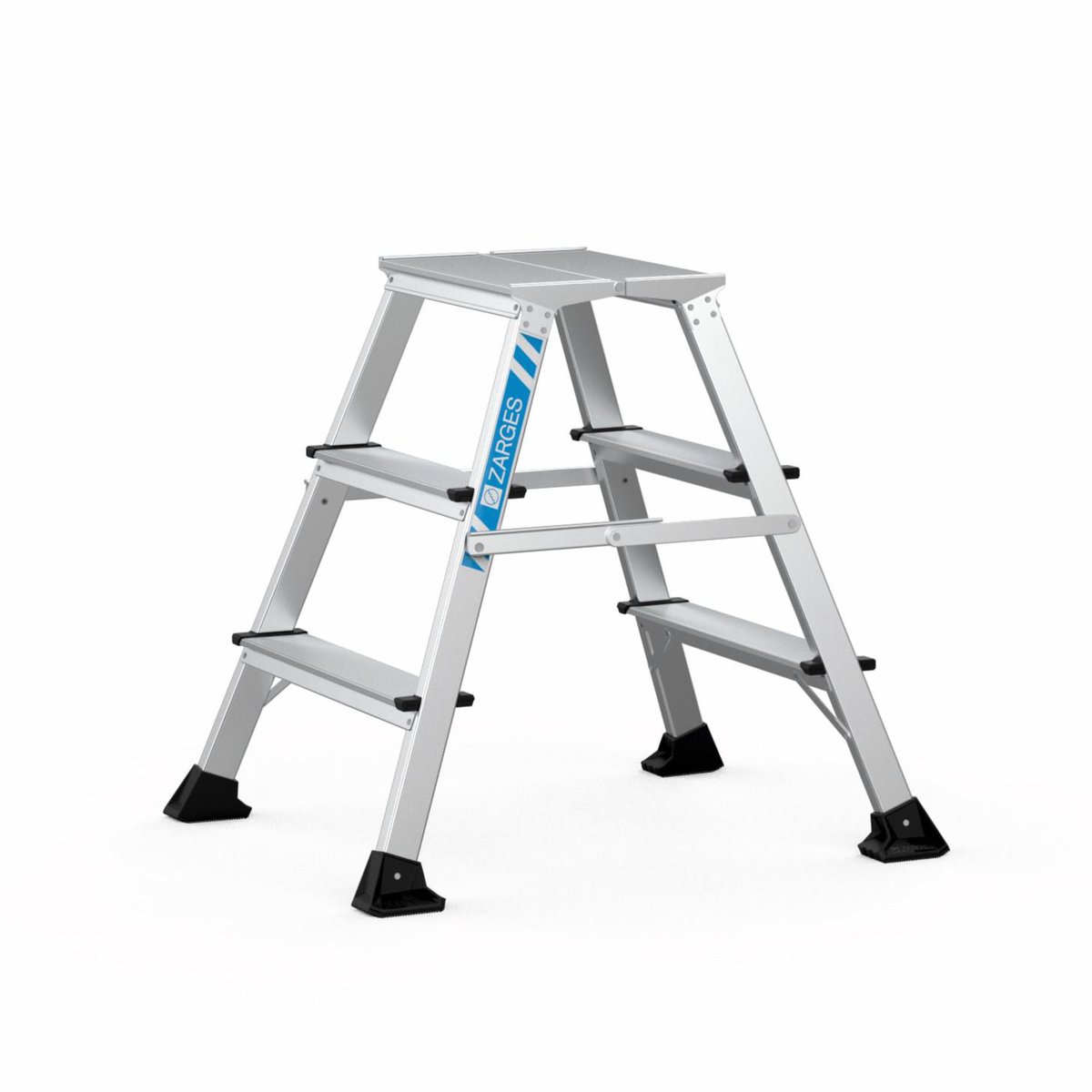 Den faste forbindelse i begge sider af bukken bidrager til en generelt forbedret stabilitet. De eloxerede vanger er ikke kun holdbare, men også modstandsdygtige over for korrosion. De dybe trin på 92 mm giver et sikkert fodfæste, og de kraftige stigesko sikrer, at bukken står solidt, selv på ujævne overflader. Transportmålene er kompakte på ca. 840 mm x 680 mm x 290 mm, hvilket gør den nem at opbevare og transportere.