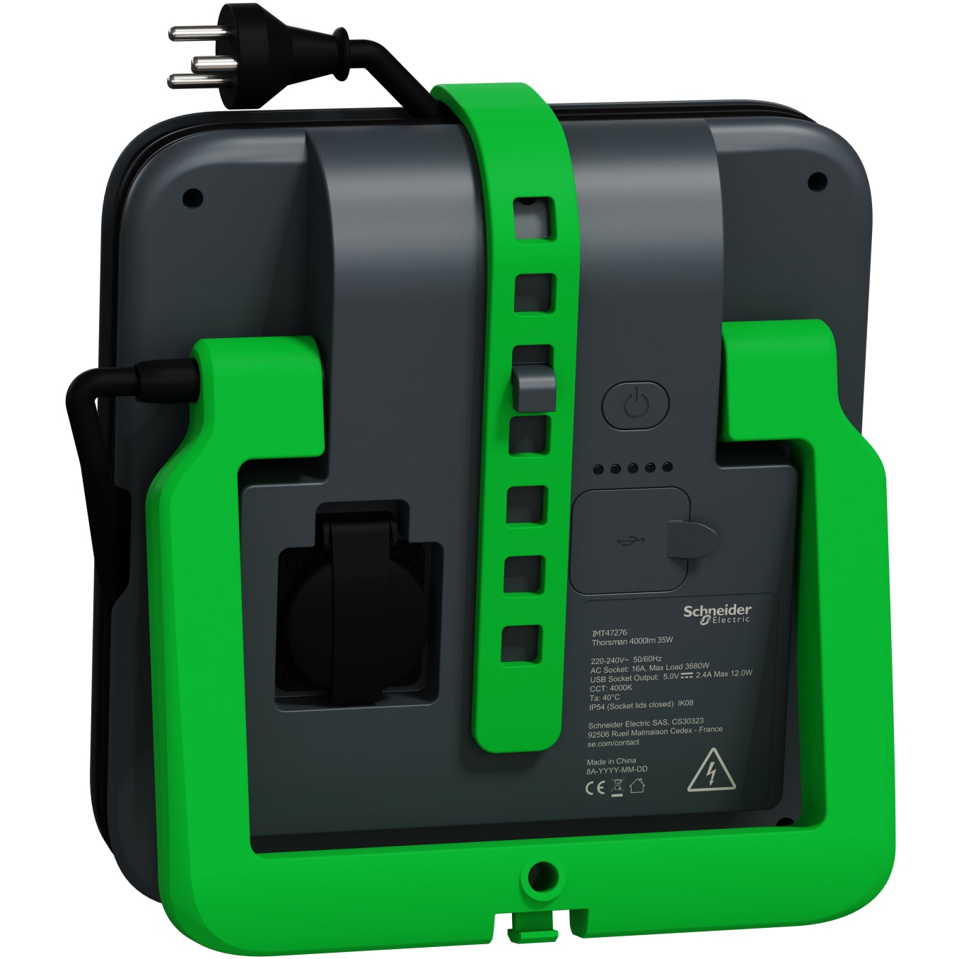 Thorsman LED-arbejdslampe med 4000 lm lysstrøm, 4000 K farvetemperatur, 5-trinsdæmpning, IP54, IK08, 2,4 A USB-stik (type A+C) og dansk hun- og hanstik.