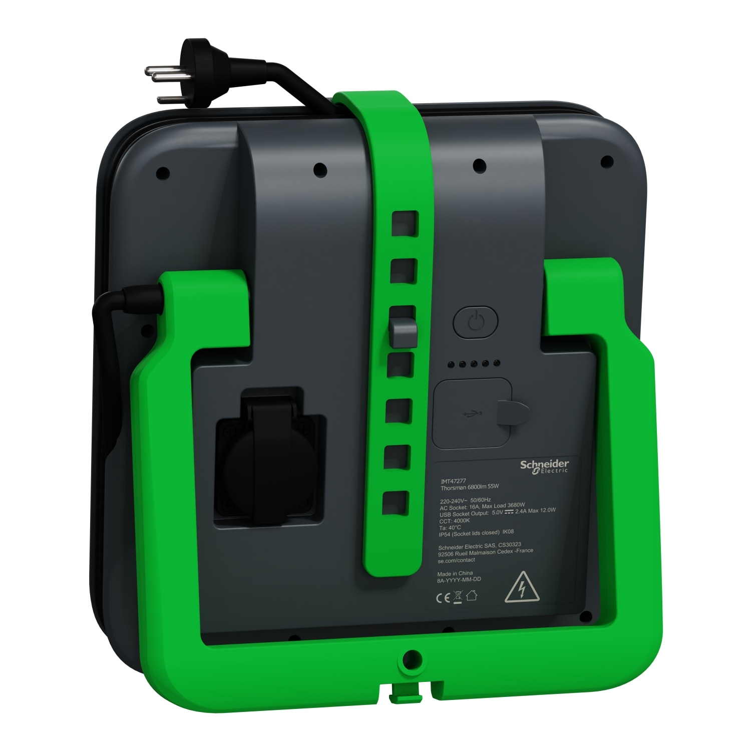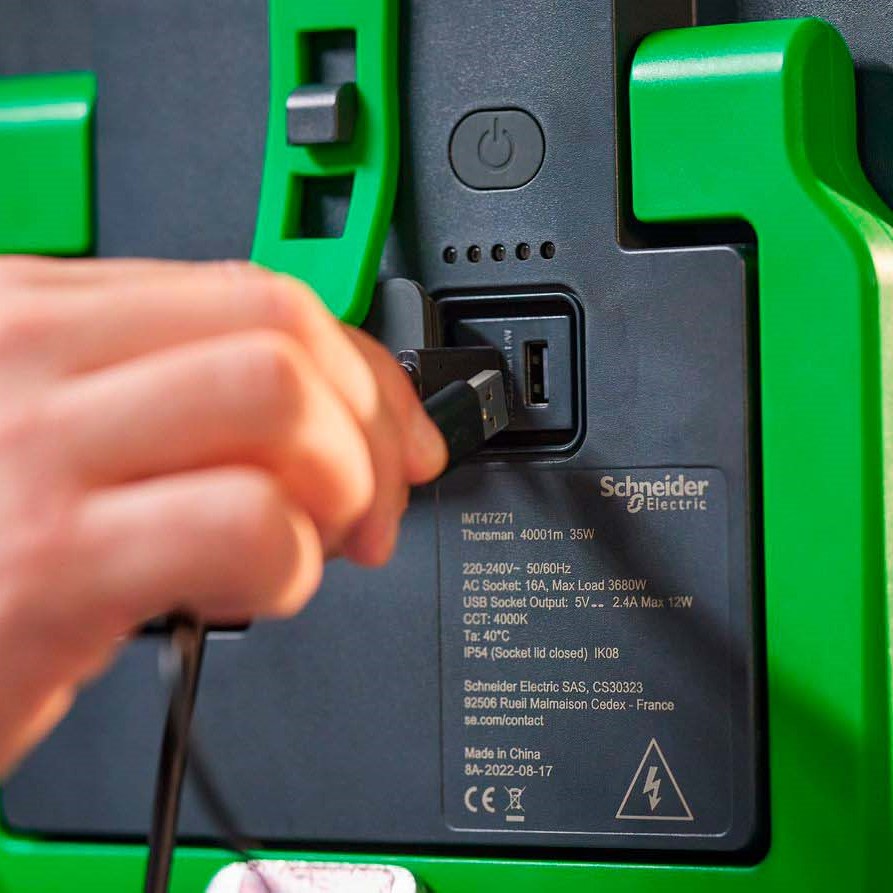Denne Thorsman LED-arbejdslampe fra Schneider Electric leverer en lysstrøm på 6800 lumen og en farvetemperatur på 4000 K. Lampen har 5-trins dæmpning, er IP54- og IK08-klassificeret og har et 2,4 A USB-stik (type A+C), dansk hun- og hanstik samt et 4 meter kabel (H07RN-F 3 x 1.5 mm²).